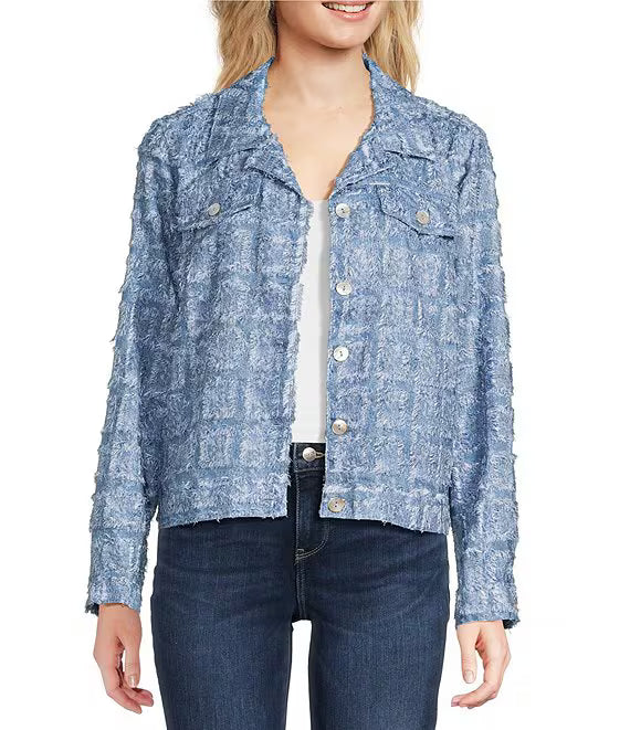 Ali Miles Woven Button Front Frayed All Over Pattern Jacket (MED BLU)
