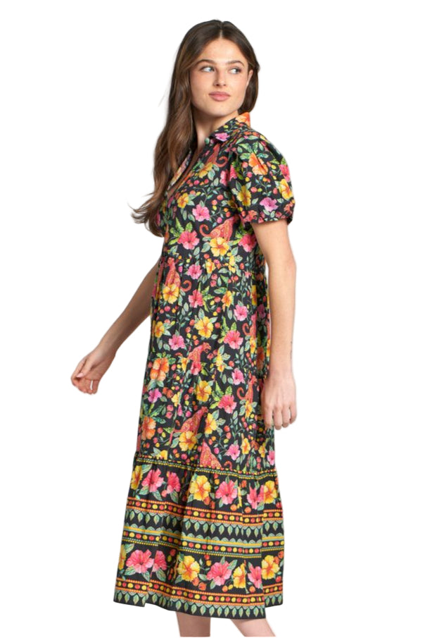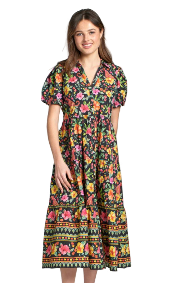APNY Bright Floral Print Puff Sleeve Tiered Midi Dress (NVY/MULTI)