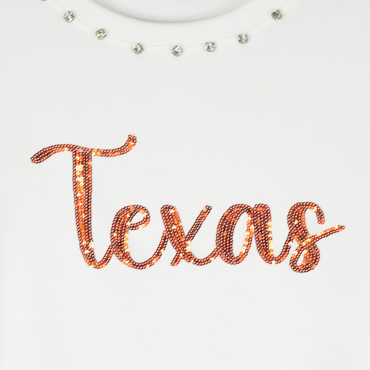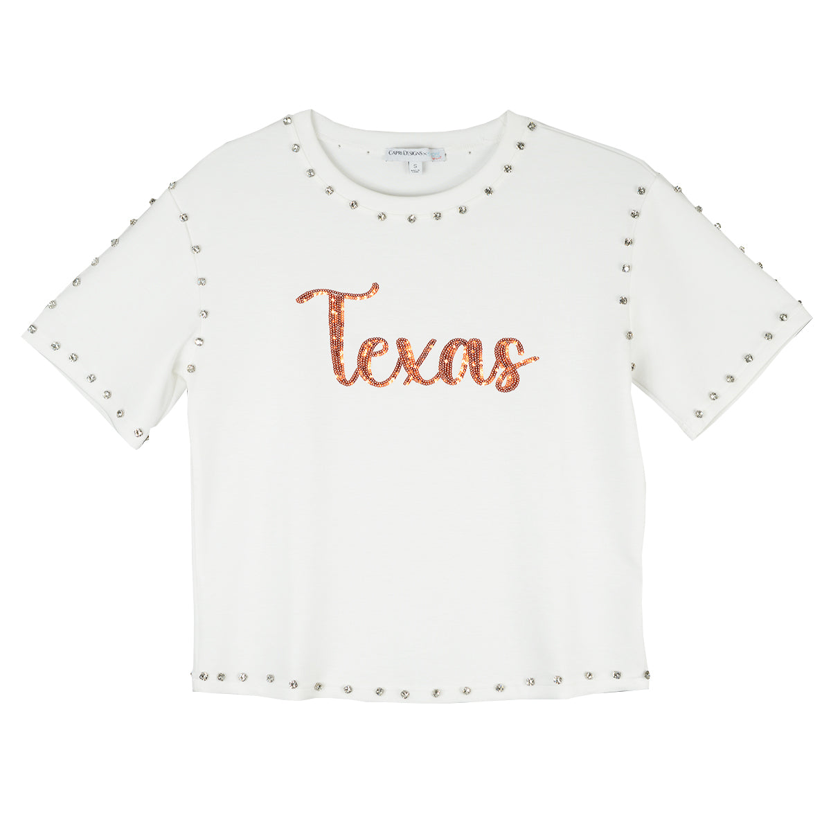 Texas Longhorn Capri Designs Sequin Script Jeweled Short Sleeve Tee (KW11TEX2408)(Off White)