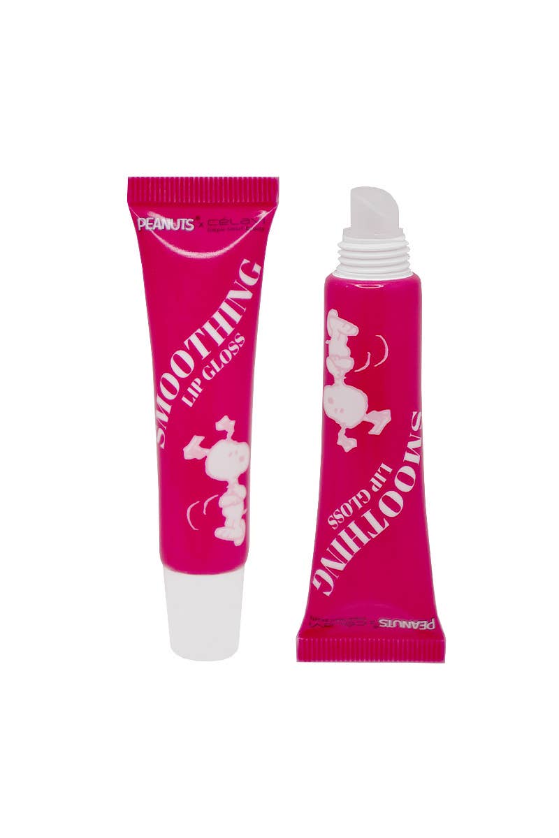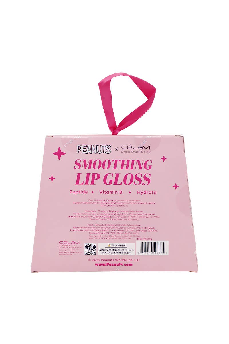Peanuts Snoopy x Celavi Smoothing Lip Gloss. A charming and effective trio designed to keep lips soft, smooth, and beautifully glossy. This 3-piece collection features three hydrating lip glosses enriched with nourishing ingredients like peptides and vitamin B, helping to maintain moisture, improve lip texture, and enhance natural softness with each application. The set includes three luscious finishes: one clear gloss for a natural shine, and two subtly flavored options in sweet strawberry and juicy peach, offering a delightful variety for everyday wear. Each tube is adorned with an adorable illustration of Snoopy joyfully dancing, adding a playful and nostalgic touch to any beauty routine. The compact design makes them perfect for slipping into purse, pocket, or makeup bag.