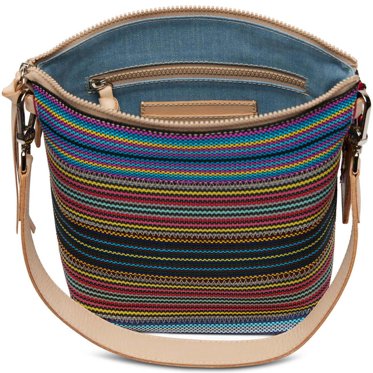 - Includes two detachable straps: a leather shoulder strap and an adjustable woven crossbody strap