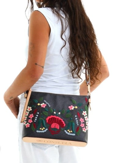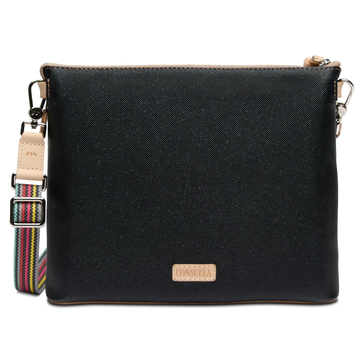 - Adjustable and removable woven strap which attaches to the bag with leather ties