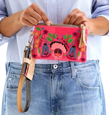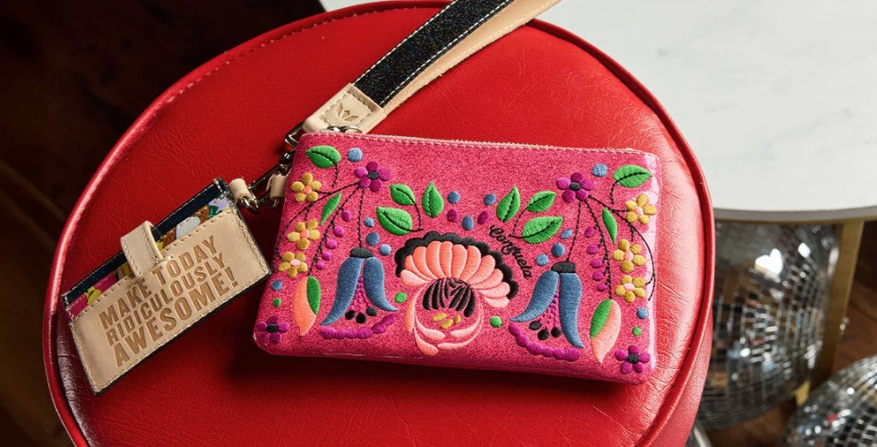 - Iconic floral embroidery on Ivy hot pink glitter exterior