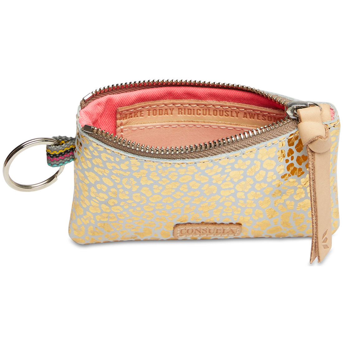 - Diego natural leather zipper pull and logo accent