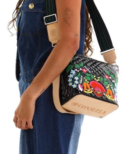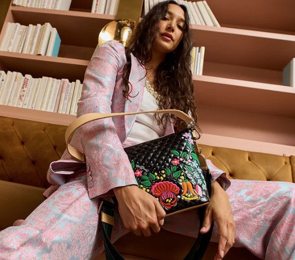 - Includes two detachable straps: a leather shoulder strap and an adjustable woven crossbody strap
