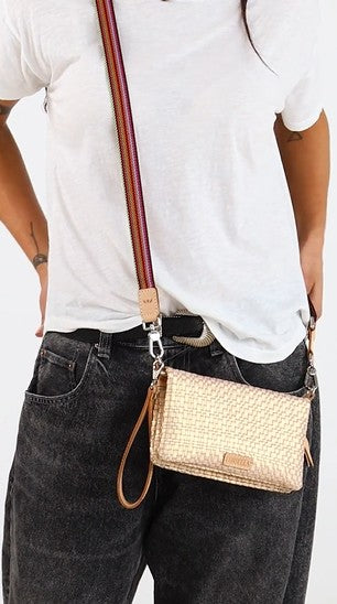 - Included detachable wristlet strap and adjustable woven crossbody strap