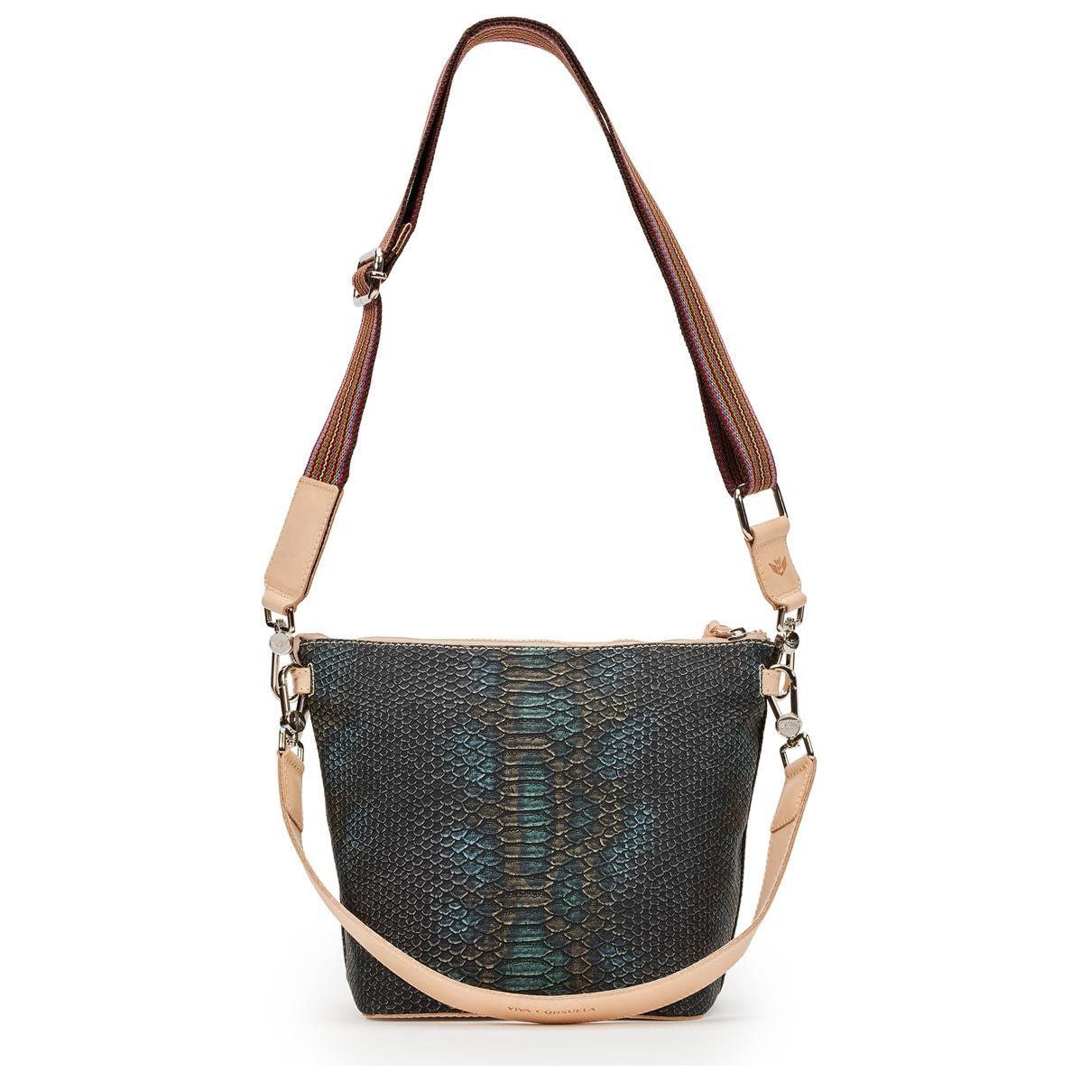 - Includes two straps: a leather shoulder strap (9 1/2" drop) and a woven crossbody strap (24" adjustable drop)