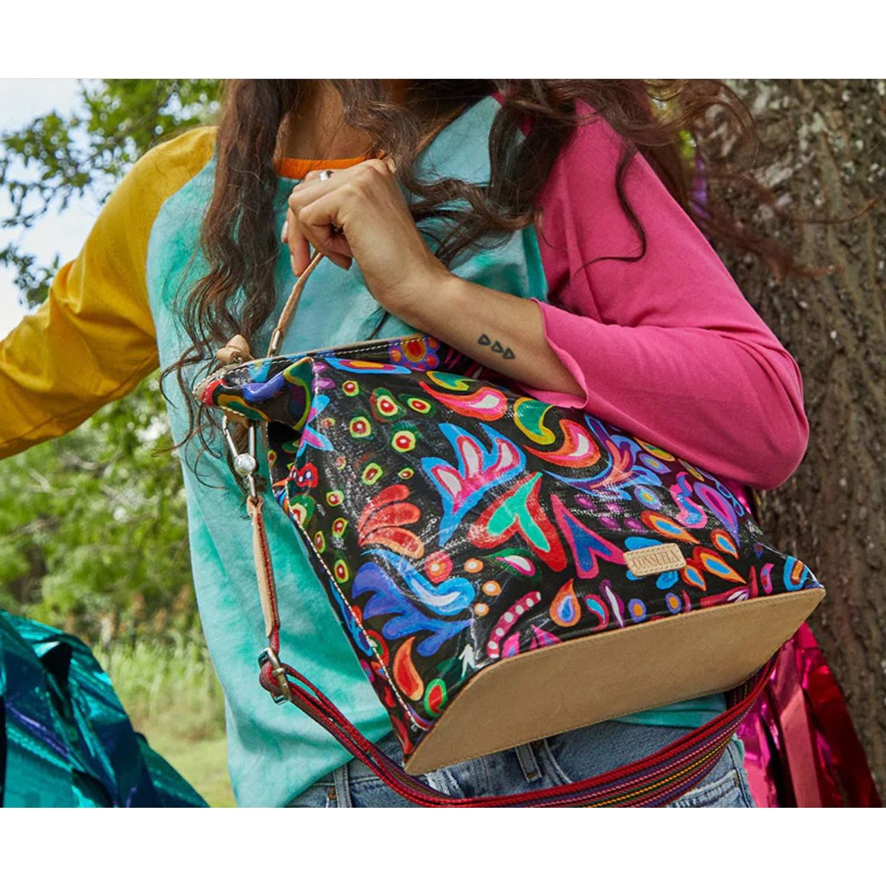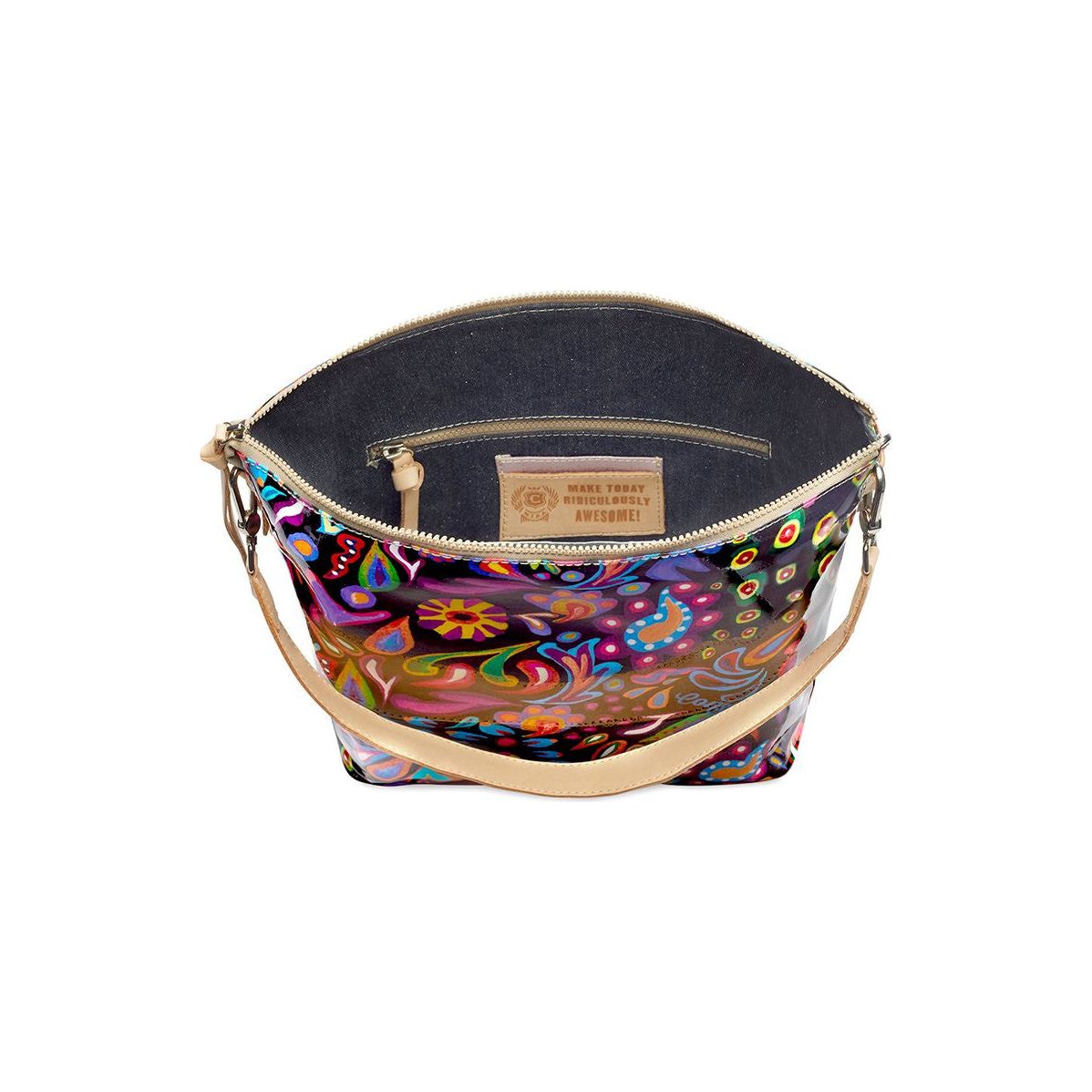 - Includes two straps: a natural, untreated leather shoulder strap and a woven crossbody strap