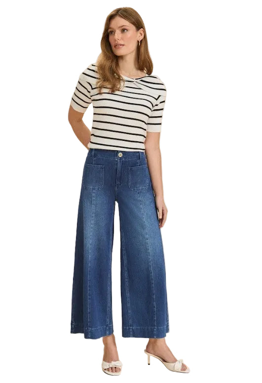 Wide-leg denim culottes with a flattering high rise and soft stretch fabric. The cropped length pairs perfectly with any shoe style, while statement front pockets add practical style. Effortlessly versatile—dress them up with heels or keep them casual with sneakers.