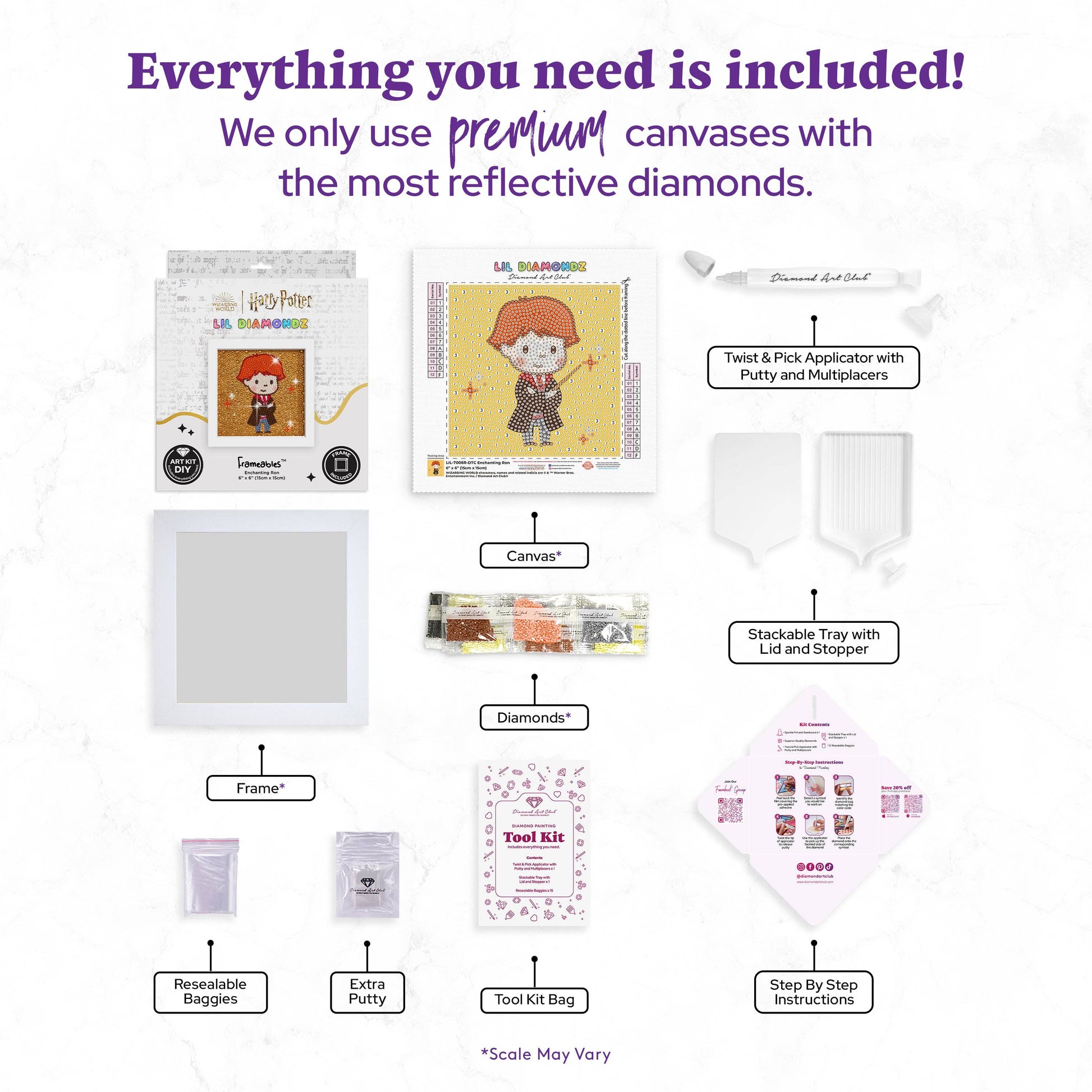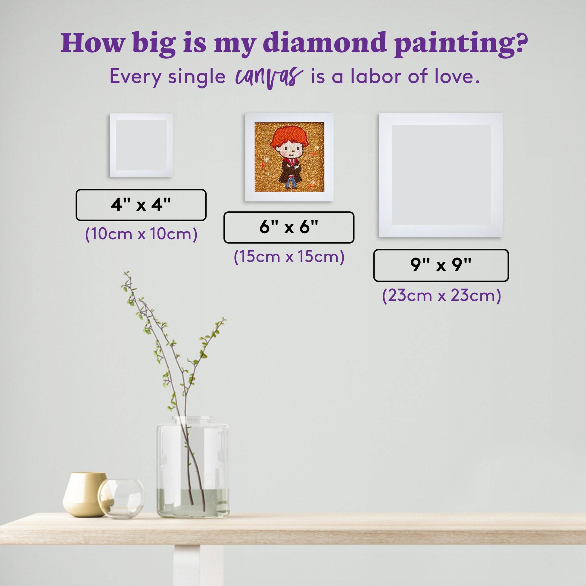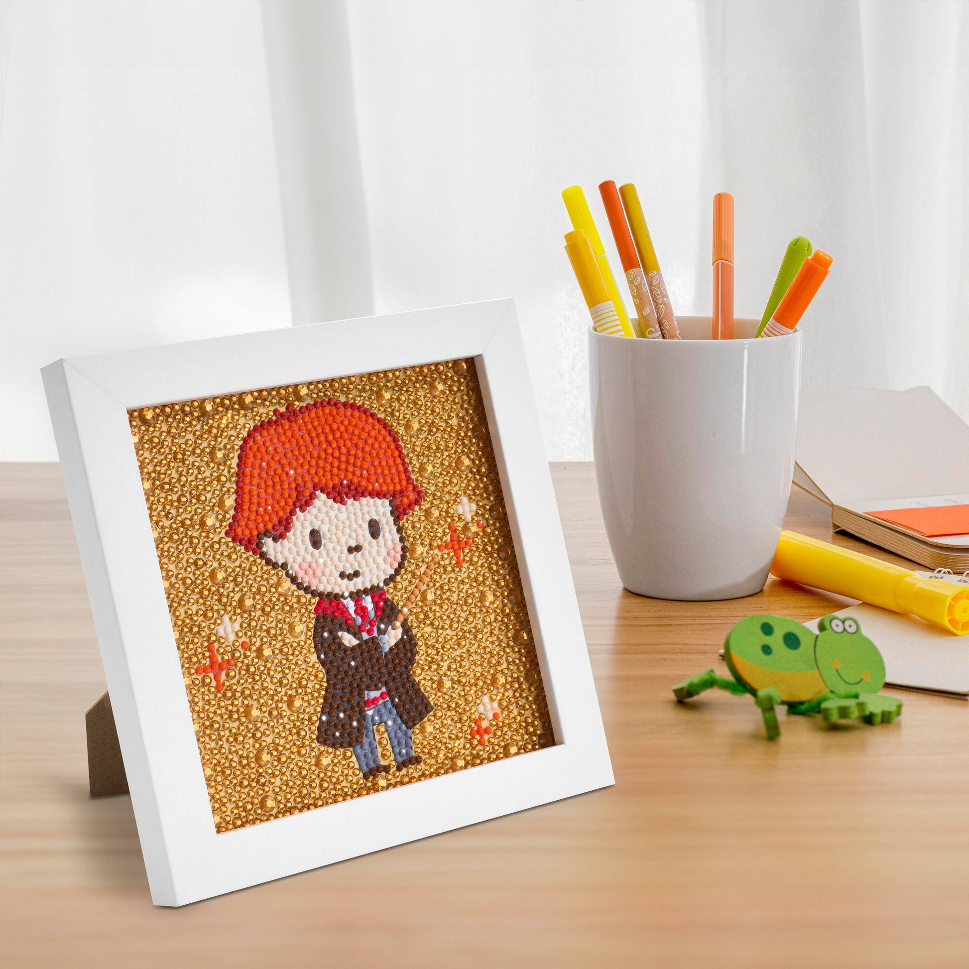 Point your wand to the sky, brave sorcerer! Let the magic within you light up the world. Introducing our NEW Frameables™—bite-sized full canvas kits that make a big impression! Each 6” x 6” mini canvas showcases your favorite characters and fits perfectly into the included 7” x 7” frame. Adorned with dazzling special diamonds, these kits add an enchanting touch to any space, whether on your desk or hanging on your wall.