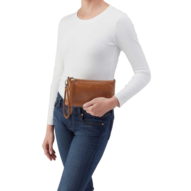 A convertible HOBO style that can be worn three ways: crossbody, baguette bag and wristlet.