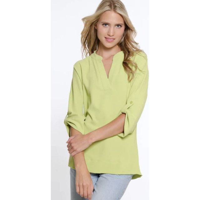 Multiples Roll Tab Sleeve Y-Neck Collar Solid Top (2 Colors)