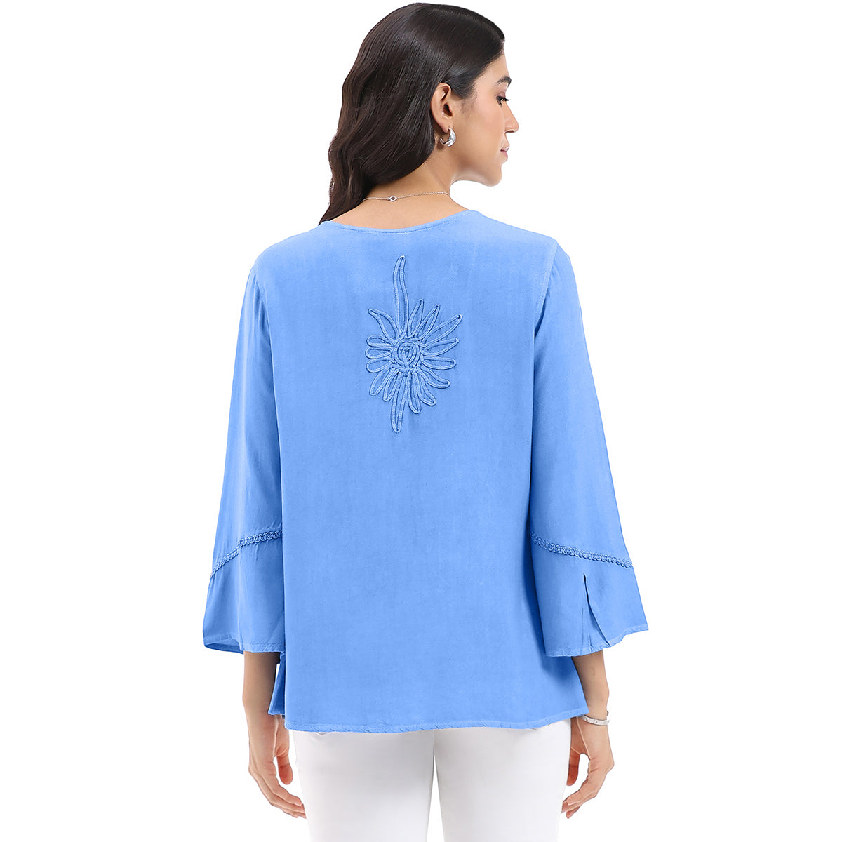 - Appliqued and embroidered floral detail front and back