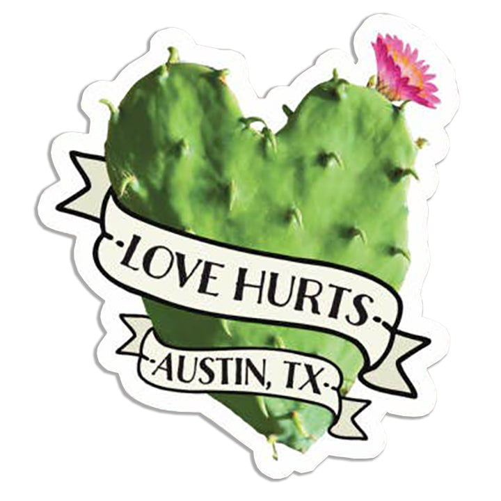 Heart shaped cactus with sash that says Love Hurts, Austin, TX.