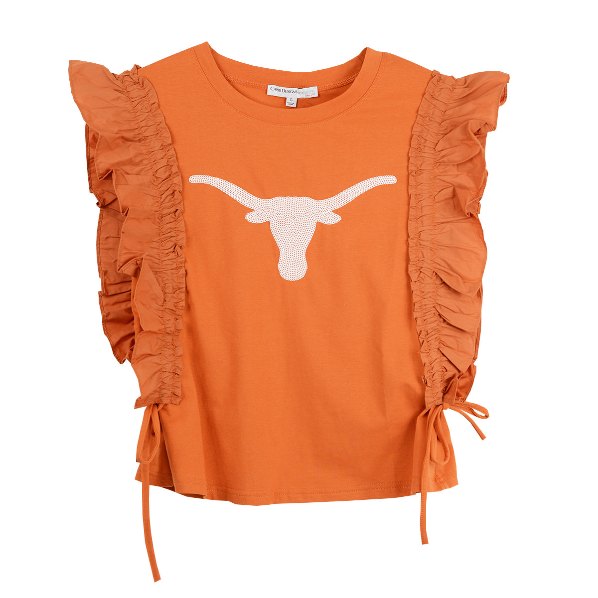 Texas Longhorn Capri Designs Sequined Varsity Ruffle Short Sleeve Ruched Top (KW12TEX2-409)(Burnt Orange)