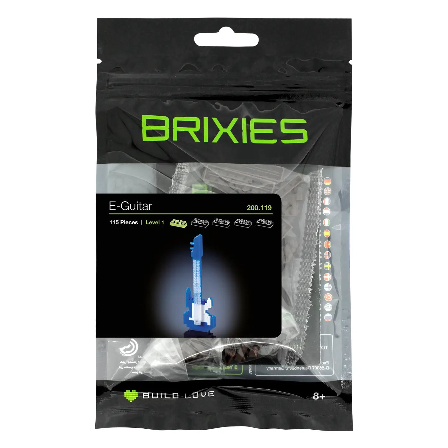 If you love music or play an instrument yourself, you will love our "BRIXIES blue electric guitar" musical instrument kit made from interlocking bricks. Play your own concerts or form a band and go on tour with your friends. There are no limits to your imagination. The model consists of a total of 115 bricks and is 4 cm long, 1.2 cm wide and 12.4 cm high when assembled. The BRIXIES building block sets are suitable for ages 8 and up. The interlocking bricks are made of high-quality ABS plastic and meet the latest safety standards. This construction kit with difficulty level 1 promotes dexterity and concentration and is also a lot of fun. And as always with BRIXIES, the smallest building blocks in the world: 5-year product guarantee out of conviction.